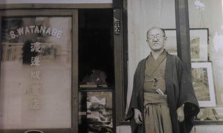 Picture shows Kawase Hasui in front of Watanabe Print Shop in Ginza, Tokyô.