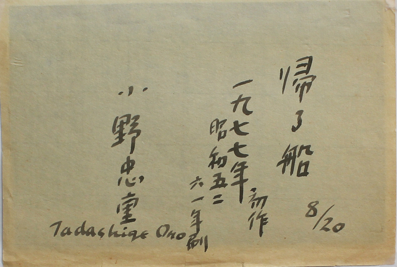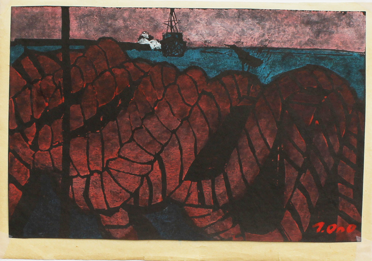 Kaeru fune (帰る船) - Ship returning to port Paper size: 22.8 x 14.8 cm. Number 8 from an edition of 20 – based on a drawing made in 1961. All details on a piece of washi, as usual (see detail 1). From the collection of the former Ono Tadashige museum, Tokyo.