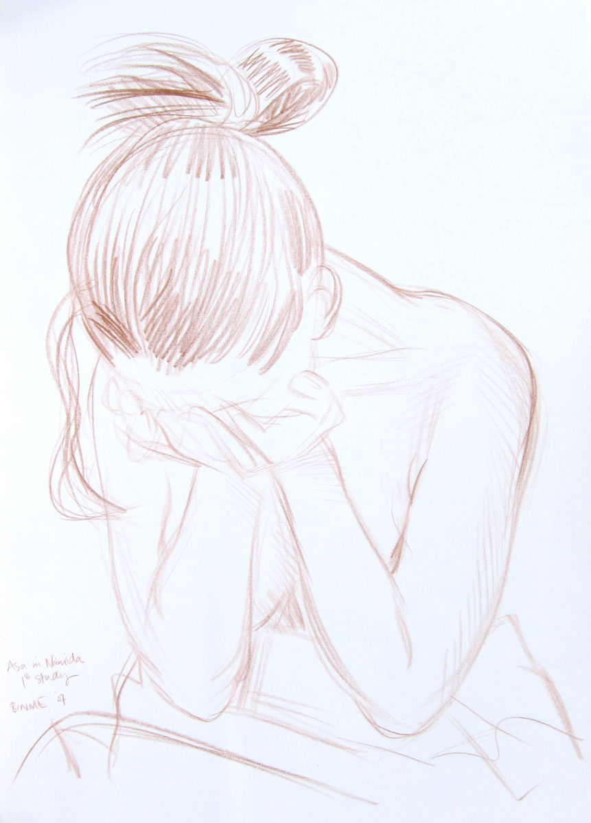 conte on paper. This print is a preliminary sketch of the woodblock print Asa ni Namida - Morning tears, realized in 2009.