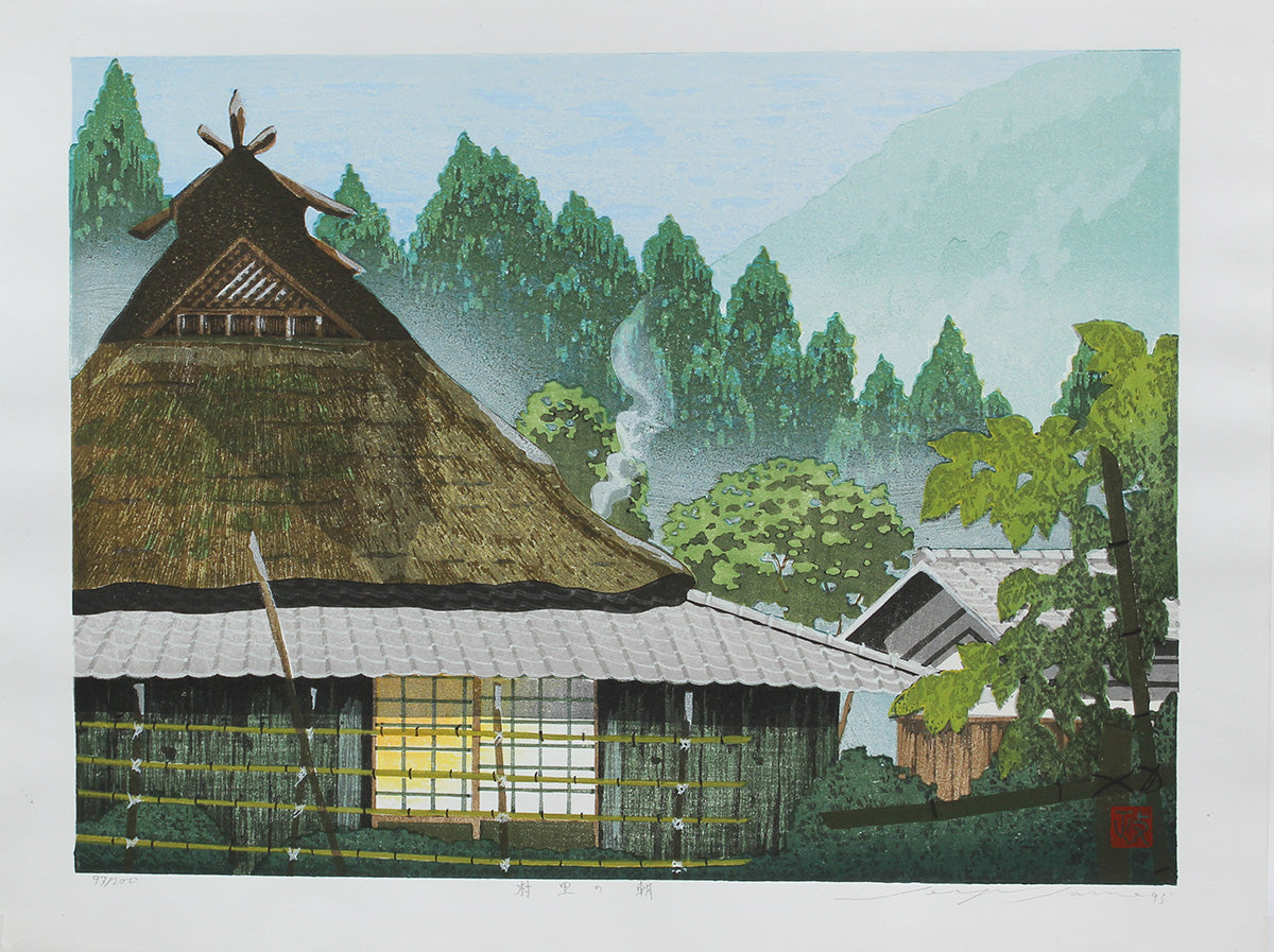 Murazato no asa (村 里 の 朝 ) - Village in the morning Paper size: 45.2 x 34.8 cm. Number 97 from an edition of 200, self-printed in 1993. Print details in pencil in the bottom margin.