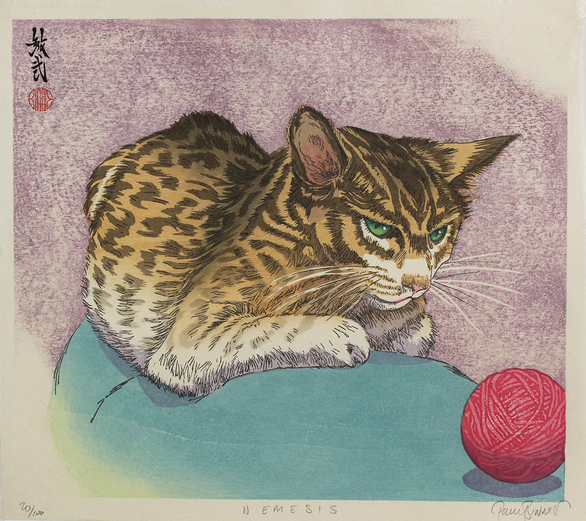 Nemesis Paper size: 37 x 33.5 cm. Self-printed in an edition of 100 in the autumn of 2019. Print details in pencil. More elaborate printing than the two smaller cats.