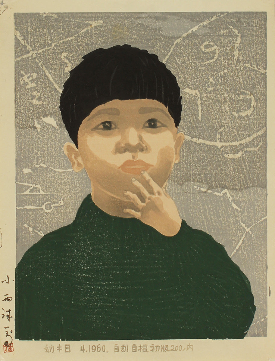 Yô kibi (幼 キ 日 ) - Childhood days Paper size: 26.1 x 33.9 cm. Self-printed and self-carved by the artist in April 1960. Signed in ink in the left margin, other details printed in the bottom margin.